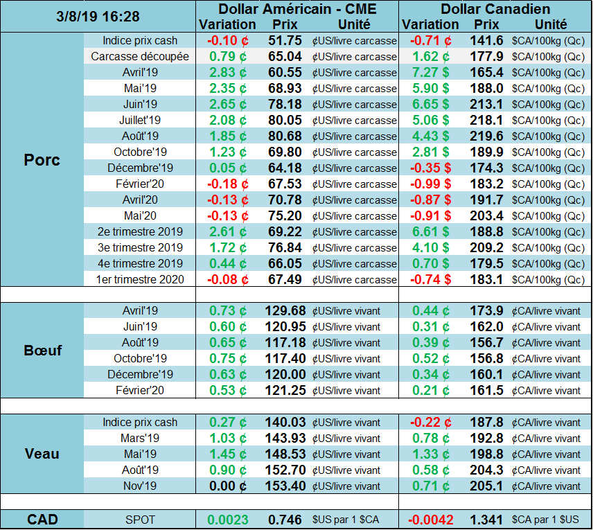 Pour le bœuf, le rapport USDA de ce midi annonçait une diminution de la production versus les données précédentes, ce qui a permis au contrat d’avril de terminer la semaine tout juste sous la barre du 130¢/lb. De plus, le marché des découpes continue de très bien performer ce qui laisse de la marge aux abattoirs pour enchérir les offres. À la dernière publication, le Select était à 218.9 ¢ et le Choice à 226.4 ¢/lb.