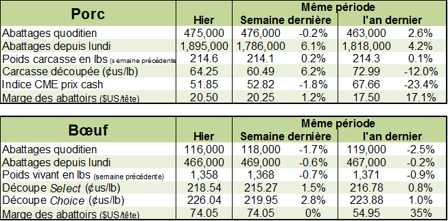 Dans le bœuf, les abattages étaient de 603,000 têtes, inchangés depuis une semaine et seulement 4,000 de plus que l’an dernier. Le poids continue de chuter ce qui s’explique par les bœufs qui ont affronté les grands froids de janvier et février. Le poids était de 1354 lbs/vivant cette semaine, 11lbs de moins que l’an dernier. C’est aussi 9 lbs/carcasse de moins que l’an dernier, les animaux n’ont donc pas autant pris de muscle que l’an dernier puisque la perte de poids est presque aussi importante pour la carcasse que la bête. La production s’établit à 489 M lbs, en baisse de -0.5% avec l’an dernier.