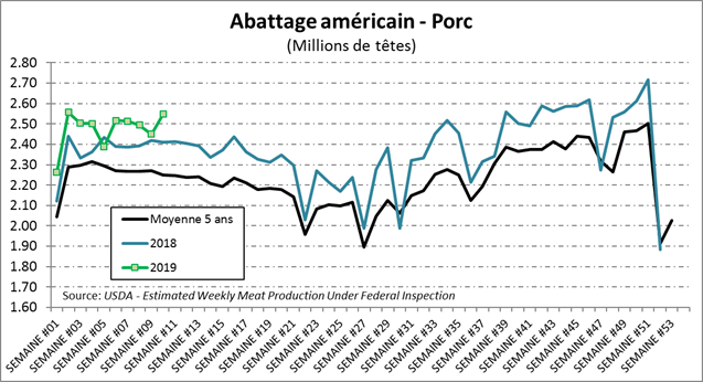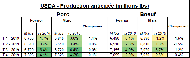 Ce midi, l’USDA a mis-à-jour ses prévisions de production. Peu de changement pour le porc à l’exception du 1er trimestre dont la production fût rehaussée de 1.4% pour refléter les abattages élevés de janvier-février. Cela amène la moyenne du trimestre à seulement +3.0% vs 2018 ce qui reste inférieur à ce qu’on observe. Notez que les prévisions pour le 3ème et 4ème trimestre demeurent extrêmement élevées à +6.4% et +4.2% ce qui n’est pas très optimiste pour le prix.