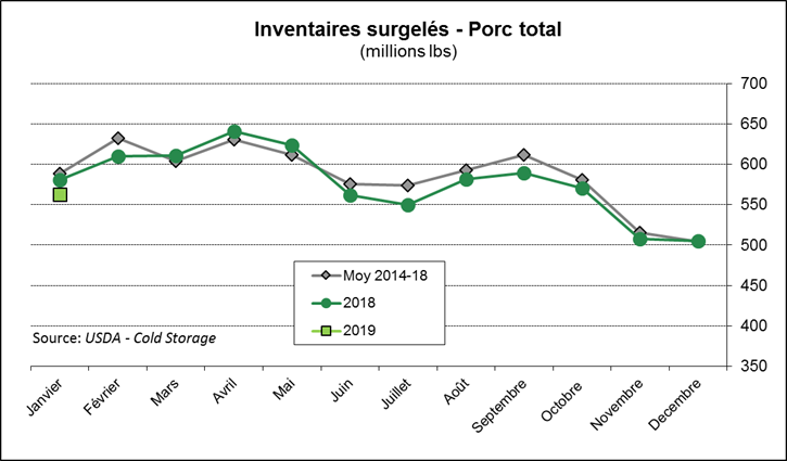 Hier à 15h00, l’USDA publiait les inventaires surgelés au 31 janvier. Dans le porc, les inventaires étaient de 563 M lbs ce qui est inférieur à l’an dernier par -3%. On note un déficit significatif dans la longe et l’épaule de porc, alors que le bacon est en surplus de 23% versus l’an dernier.