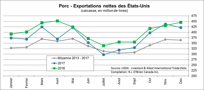 En décembre, les États-Unis ont exporté 526 M lbs de porc contre 80 M lbs importées, pour des exportations nettes de 446 M lbs. Ce sont les plus grosses exportations nettes depuis le mois d’avril 2018, avant l’imposition des tarifs douaniers chinois et mexicain. Les principaux clients étaient le Mexique (140 M lbs), le Japon (92.8 M lbs) et la Corée du Sud (77 M lbs). Les exportations nettes de décembre étaient 5.7% de plus qu’an décembre 2018 et pour l’année 2018 au complet, les exportations étaient 6.9% de plus que les 12 mois de 2017.