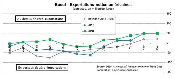 Pour le bœuf, comme à chaque fin d’année après que le quota de bœuf australiens et néo-zélandais sont atteints, les américains deviennent exportateurs nettes de viande bovine. En ligne avec l’an dernier, les exportations nettes était de 49 M lbs, constituées de 262 M lbs exportées (Japon et Corée du Sud comme plus gros acheteurs) versus 213 M lbs importées (Canada, Mexique et Australie).