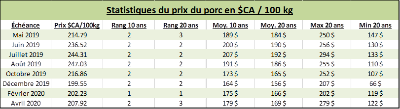 Au niveau des prix en $CA, toutes les échéances surpassaient la barre symbolique du 200 $CA/100kg ce matin. Autrement dit, l’ensemble des 16 prochains mois peut être fermé à profit présentement. Les prix de juin à décembre 2019 représentent le 2ème meilleur prix en 20 ans, après 2014. Pour février 2020 à 202.20 $CA/100kg, c’est même au-dessus du prix de 2014 (par quelques cents…). Une stratégie intéressante peut être de concentrer les protections d’octobre à avril 2020 afin de s’assurer d’être rentable pendant l’hiver 2019-20, mais de garder le potentiel haussier pour les mois d’été 2019 et 2020.