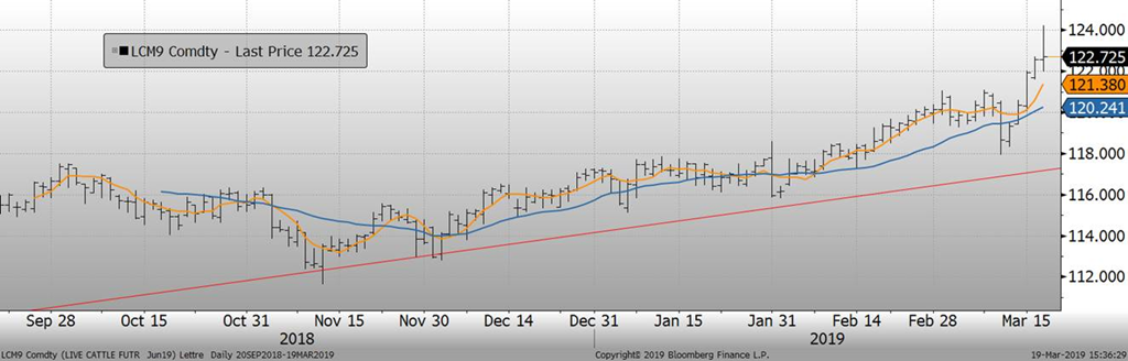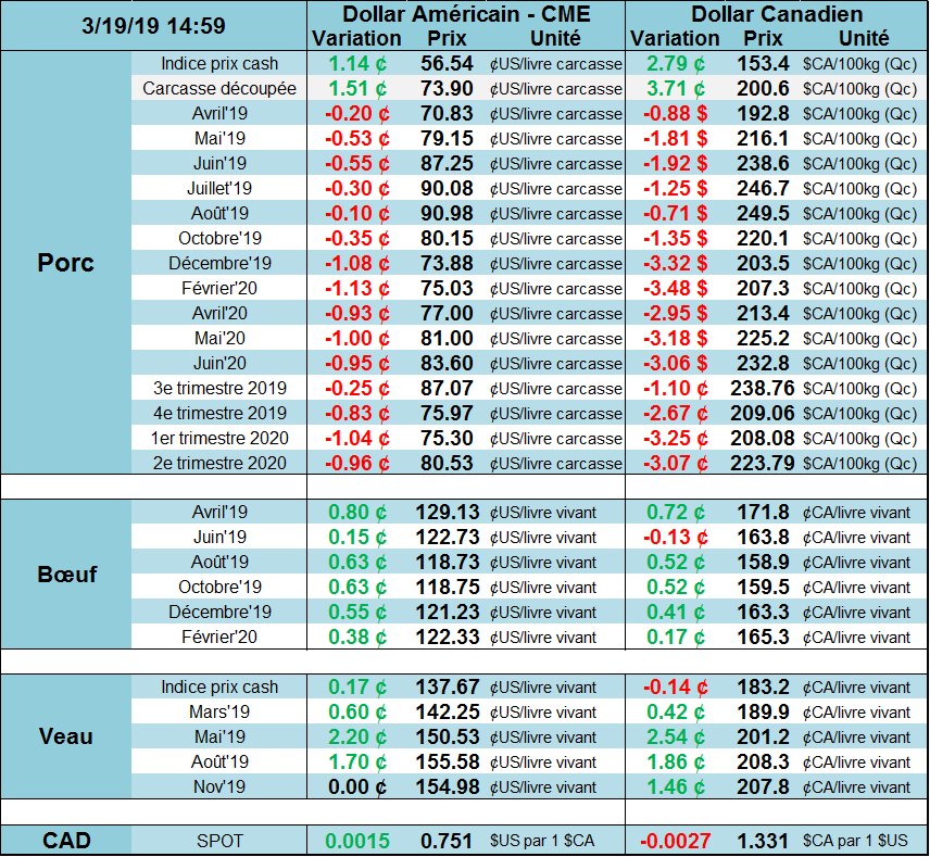 Le USDA a rappelé que le rythme d’abattage avait diminué de 1.3% versus l’an dernier alors la production de viande a diminué de 2.3% signe que le poids est à la baisse par rapport à 2018. Il sera intéressant de suivre les rencontres entre le président brésilien et américain aujourd’hui. En fait, M. Bolsonaro souhaiterait la réouverture du marché américain aux produits bovins brésiliens. En échange, il propose d’importer davantage de blé et d’éthanol américain. De plus, avec la hausse des ventes de viande de porc américains sur les marchés d’exportations, peut-être que certains importateurs voudront acheter des produits bovins américains afin de mitiger le risque d’approvisionnement futur.