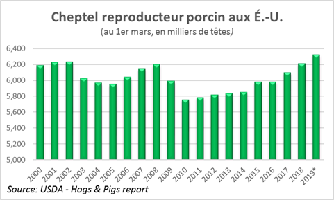 Le rapport du mois de mars devrait tout de même donné le ton pour le reste de l’année 2019 au niveau des prix. Dans le tableau des estimations, on note que les analystes demeurent très modestes dans leurs anticipations. En fait, ceux-ci mentionnent le fait que les producteurs n’étaient pas en mode « croissance » cet hiver en raison des pertes financières associées aux mises en marché des 2 derniers trimestres. Pourtant, tout le monde savait que c’était une question de temps avant que la Chine doive s’approvisionner sur les marchés internationaux. De plus, il est surprenant que les producteurs ont conservé autant d’animaux reproducteurs parmi le cheptel. En fait, le nombre de reproducteurs disponibles est à un sommet des 20 dernières années et continue de grossir, ce qui laisse place à une croissance de la production. Aussis, avec un prix de grains qui est probablement au plus faible des dernières années, il ne faudrait pas se surprendre que le cheptel porcin et les mises en marchés battront tous les records en 2019 et probablement 2020.