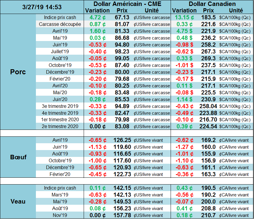 À chaque 3 mois, l’USDA envoie un sondage à 8,500 producteurs répartis dans les différentes strates de production. Par la suite, normalement l’USDA reçoit les réponses pendant les deux premières semaines du mois de publication. Ainsi pour le mois de mars 2019, le USDA a conclu la collecte de données le vendredi 15 mars. En temps normal, on parle peu du mécanisme de l’USDA, mais les temps sont plutôt spéciaux présentement dans le porc comme tout le monde le sait. Les intentions des éleveurs au début mars a possiblement changé depuis la hausse du prix. Le « timing » de la hausse des prix du porc combiné avec les réponses au sondage répondu par les producteurs seront très attendus par le marché.