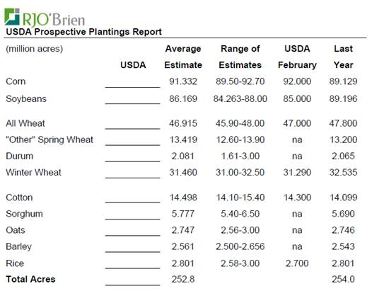 Le marché s’attend à une hausse des acrages de maïs d’un peu plus de 2 millions d’acres. De 89.1 l’an passé à possiblement 91.3 cette année. Faut il encore que Dame Nature coopère. M’enfin. Attendons à vendredi voir le chiffre, et apres on s’obtineras, ok? L’augmentation des semis de maïs sont en lien avec la baisse (prévue) des semis de soja. Dans la binne, on s’attend à voir 3 millions de mois ; de 89.2 l’an dernier à possiblement 86.2