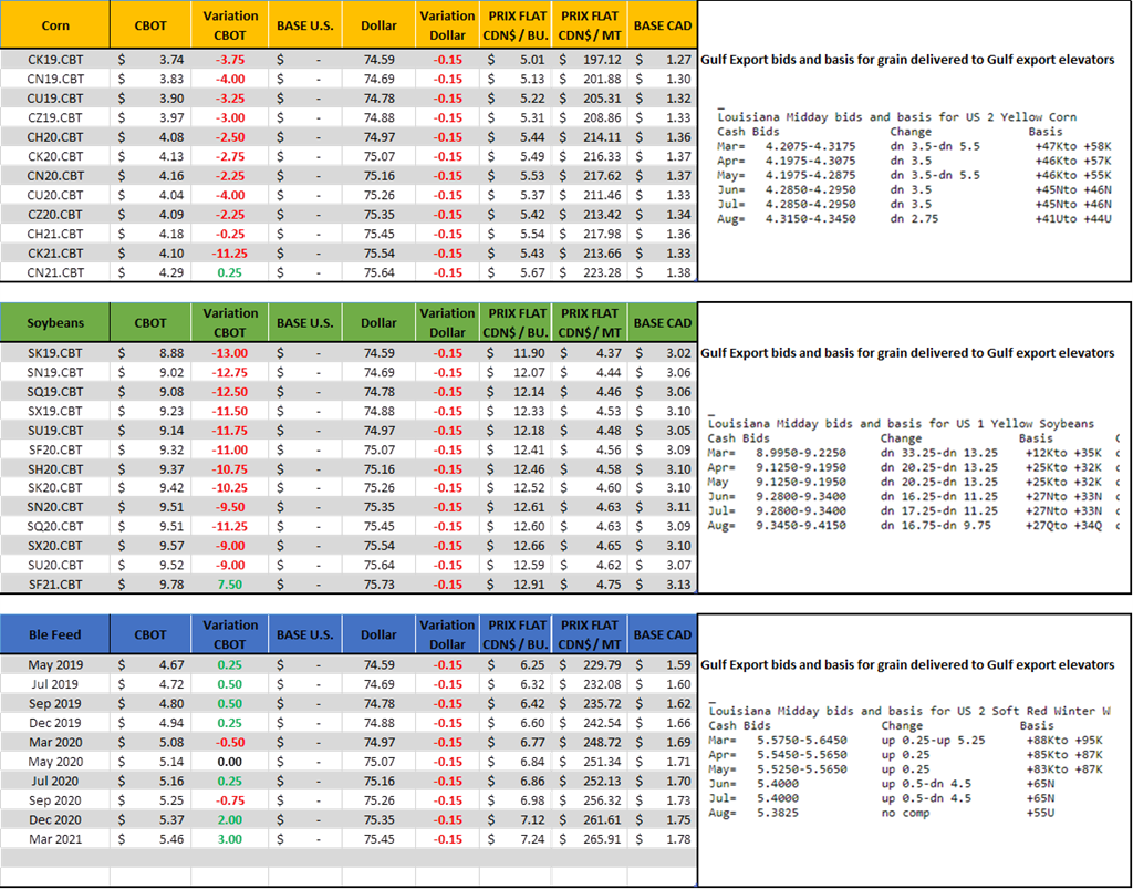 Le CBOT avait l’air en lendemain de veille. Surtout le soja. Le contrat de fève sur mai 2019 a brisé la barrière du 9$bu et se promène sans trop de conviction dans le même range depuis l’été passé. Depuis que les prix ont cassé littéralement l’an passé, on transige entre 8.50 et 9.50 selon les aléas du marchés, des vendeurs et des producteurs, de la Chine et de l’Amérique du Sud.