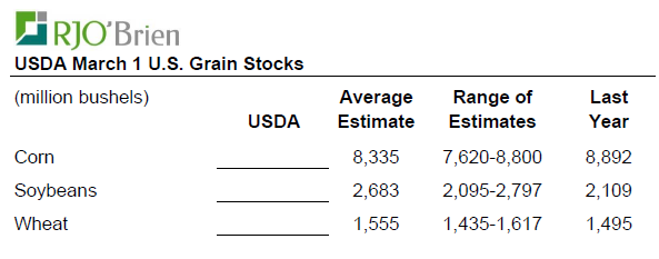 Les inventaires de maïs seraient plus faible qu’à pareille date l’an dernier. La baisse étant principalement dû au ‘boost’ d’exportation qu’on a vu l’été dernier. S’il reste 8.3 milliard de boisseaux en mars, le marché ne devrait pas etre en mode panique car même avec une bonne utilisation il va en rester pour la fin de l’année. Comme je dis souvent, ou il y en a moins que l’an passé, mais on est loin d’en manquer. Dans le soja, la situation est encore la meme qu’on voit depuis un certains temps déjà : les surplus sont important et l’export ne roule pas assez vite pour passer à travers la montagne.