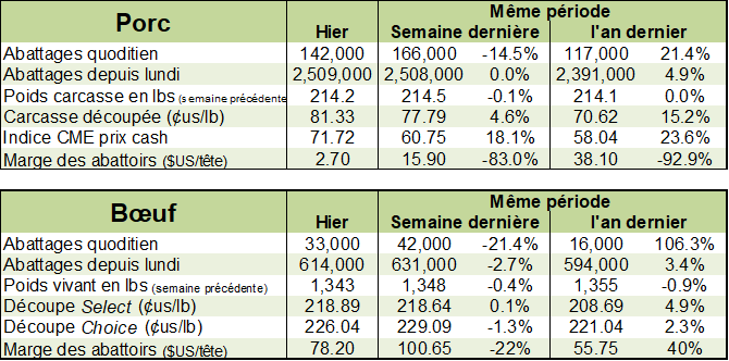 Le prix au comptant a chuté pendant toute la semaine dernière perdant près de $3/ tête. Le nombre de bœufs gras mis en marché fut de 614 000 ce qui représente une hausse de 4% par rapport à la même semaine en 2018. Le poids moyen des bœuf abattus était à la baisse de près de 11 livres par rapport à 2018. Ainsi malgré la hausse du nombre de bêtes abattues, la production de viande de bœuf était seulement à la hausse de 2.6%