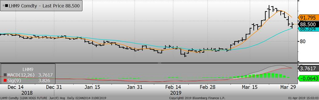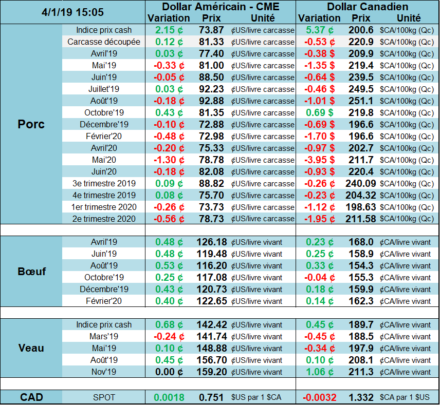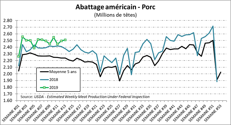 Le vice-président chinois est en visite à Washington cette semaine afin de faire avancer les discussions entre la Chine et les États-Unis. Pour l’instant, le ton est positif alors que des avancées réelles semblent avoir été réalisées la semaine dernière. Les rumeurs veulent qu’une entente soit bientôt annoncée et que les tarifs soient retirés. Le marché doit aussi lutter avec l’idée que la production américaine demeure très élevée alors que le USDA a rapporté que le usines d’abattage avaient abattus 5.6% plus de porcs que la même semaine en 2018. Le poids moyen des porcs abattus était aussi en hausse comparativement à l’an dernier (215 versus 214 livres).