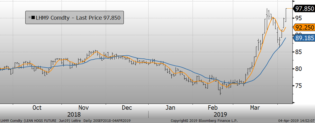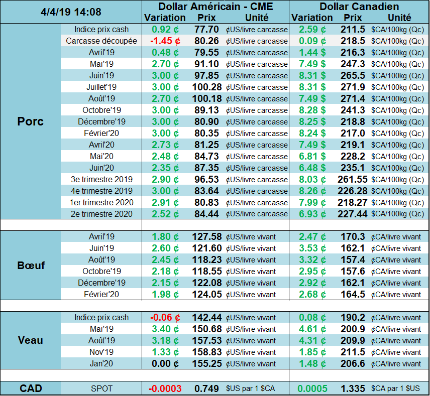 Pour ceux et celles qui s’intéressent un tant soit peu à l’analyse boursière, il faut absolument noter le comportement des contrats à terme de porc depuis 1 semaine, et ce, encore davantage avec la remontée des 2 derniers journées. Dans la première vague “acheteur” en mars, les contrats éloignés (fin 2019 et 2020) se sont rapidement hissés à la hausse tirant les contrats rapprochés. Dans un marché normalement « bullish », on devrait noter l’inverse, soit une montée des prix plus prononcée pour les contrats rapprochés. Les prix ont reculé à la fin mars retraitant de presque 50% de la hausse enregistrée pendant la première moitié du même mois. Or, dans la 2ième vague haussière que nous constatons présentement, les contrats de mai et juin sont définitivement les leaders dans cet environnement avec des gains plus rapides que les mois éloignés. C’est un signe qui ne trompe pas et suggère une forte demande de la part des consommateurs ou acheteurs. Pourtant, ces mêmes acheteurs ont semblé avoir ralenti sur leurs achats puisque depuis 3 jours alors que le prix de la découpe fait du surplace et même baisse. Devrait-on y voir quelque chose de temporaire?