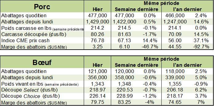 Les abattages demeurent au-dessus des anticipations et le prix au comptant ralenti rapidement. Le prix cash des ventes d’hier montait de seulement +0.32 cent comparativement aux publications précédentes à +1.00 ou +2.00. Le marché boursier continue donc de monter sur des « possibles » à venir d’une forte demande. Ces possibilités demeurent bien évidemment la fin des tarifs entre la Chine et les États-Unis ainsi que la forte demande chinoise. Les deux pays seraient très prêt d’une entente et donc du retrait de ces taxes à l’importation. La fièvre porcine africaine fait son chemin dans d’autres pays alors qu’on retrouve des cas au Cambodge présentement, démontrant la difficulté de maitriser le virus. Ainsi la maladie a traversé les frontières du Vietnam assez rapidement. Et finalement, un autre cas a été répertorié par la Chine. Celui-ci se situe dans la province du Yunnan. Encore une fois tous les ingrédients semblent réunis pour traverser les sommets atteints il y a à peine un mois.