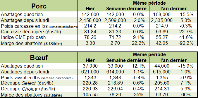 Le marché attend aussi la conclusion des négociations entre la Chine et les Etats-Unis. Le pays pourrait devenir un fournisseur plus important de produits de bœuf si une entente se concluait dans les prochains jours.