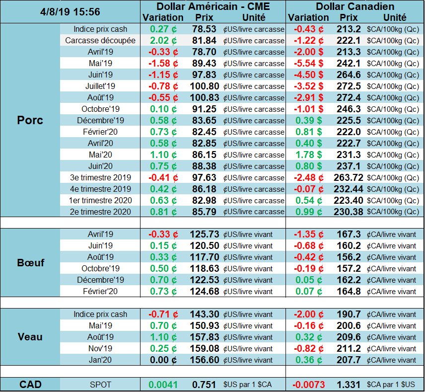 Les données d’abattages continuent de surprendre alors que le nombre de porcs mis en marché se situait encore en hausse par rapport à 2018. Les abattoirs ont reçu des livraisons de 2 458 000 porcs la semaine dernière ce qui représente une hausse de 5.4% par rapport à la même semaine en 2018. Ce qui sauve la situation est le poids inférieur à l’an dernier, mais avec les prix observés, on s’attend pas à ce que le poids demeure plus faible que l’an dernier très longtemps. Donc, la production hebdomadaire était de 526.5 millions livres, soit 5% plus de viande que l’an dernier.