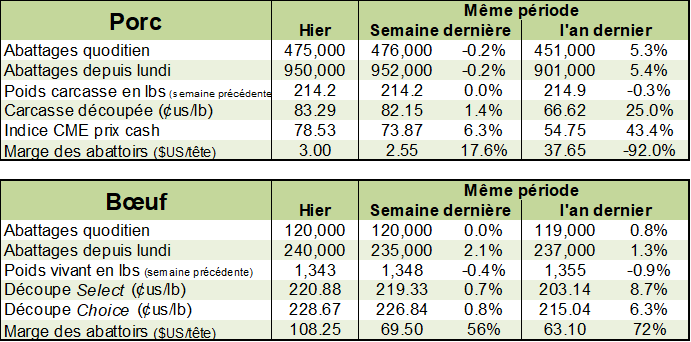 Il existe un certain espoir que la Chine pourrait acheter davantage de viande de bœuf américain au cours des prochains mois. Pour l’instant, le marché n’anticipe pas cette opportunité, mais on lit des commentaires positifs quant à cette avenue. Les exportations publiées ce matin furent satisfaisantes avec des ventes de 11 800 tonnes métriques. Hong Kong était le principal destinataire de cette viande.