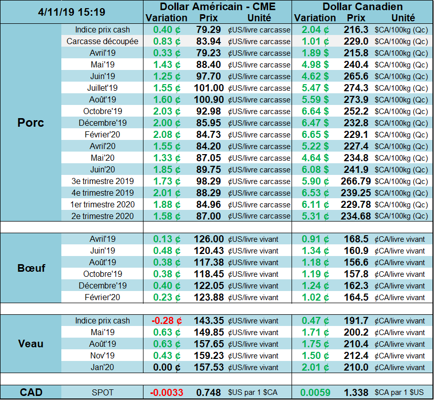 Au niveau du marché cash, c’est un peu moins optimiste. Le prix cash d’hier était à la baisse de -0.12 cent/lb, une première depuis le début mars. Le marché des découpes montent légèrement aujourd’hui à 84.43 cents. C’est un gain de seulement 1.14 cents en 3 jours.
