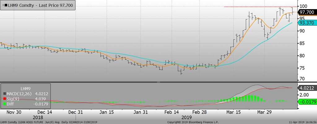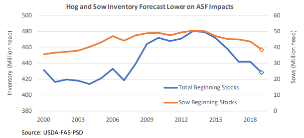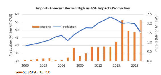 Le USDA a aussi mis à jour la production de viande de porc prévue en Chine cette année et l’organisme estime que le pays pourra produire environ 48.5 millions de tonnes de viande de porc ce qui représenterait une baisse de -10.3% par rapport à 2018. De plus, il ajoute que le cheptel porcin en Chine estimé pour la fin de 2019 pourrait se chiffrer à 350 millions de têtes une baisse de 18% et un creux des 30 dernières années. Les conséquences prévues pour 2019 sont de :
