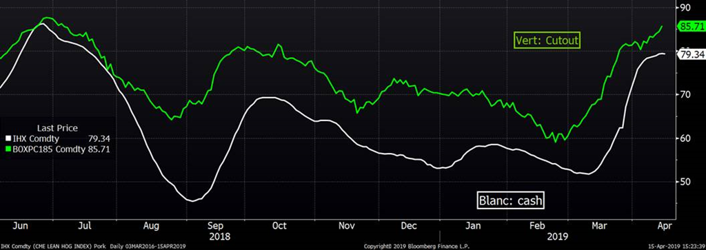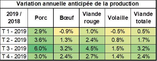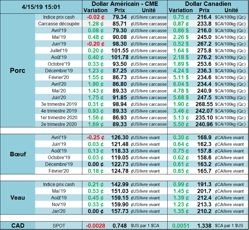 Malgré le positivisme du marché, il faut rappeler que le USDA prévoit tout de même des hausses de production de plus 3.6% pour le 2ieme trimestre de 2019 versus 2018. Et pour les derniers trimestres de l’année, le USDA prévoit des hausses de plus de 6% et 3% respectivement. Les contrats à terme sont à prime de plus de $20 USD / 100 livres par rapport au prix au comptant présentement ce qui est anormalement élevé à ce stade dans l’année.