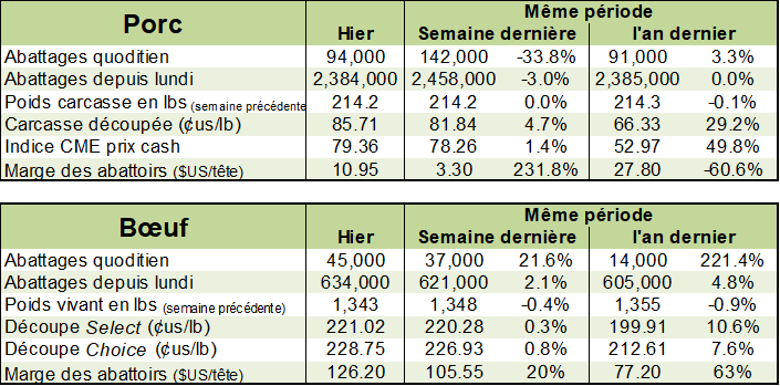 Les intempéries dans le Midwest de la semaine dernière peuvent-elles avoir provoqué la baisse des abattages? Sur une base hebdomadaire, les abattages ont été à la baisse de 3% par rapport à la semaine précédente. Quand on compare avec l’an dernier, la hausse fut tout de même de 0.5% ce qui est loin du rythme des dernières semaines alors que l’industrie abattait plus de 5%