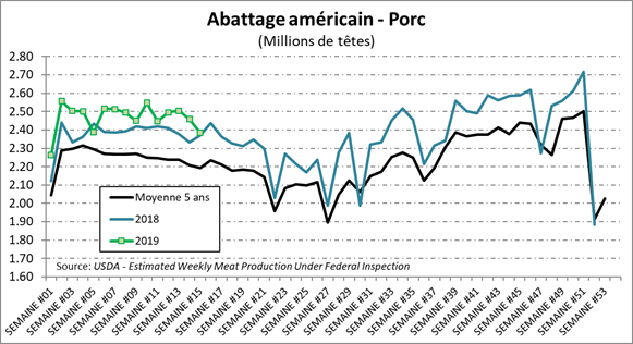 Les données de poids moyens des bêtes abattues ont été encore une facteur limitant l’offre globale de viande de bœuf. Les poids carcasses sont encore en baisse de 8 livres rapport à 2018. Par contre, à regarder les rapports du Cattle-on-feed, on peut difficilement justifier des hausses intempestives puisque les ranchers veulent augmenter l’offre de bêtes dans les parcs au cours des prochains mois.