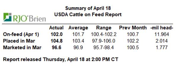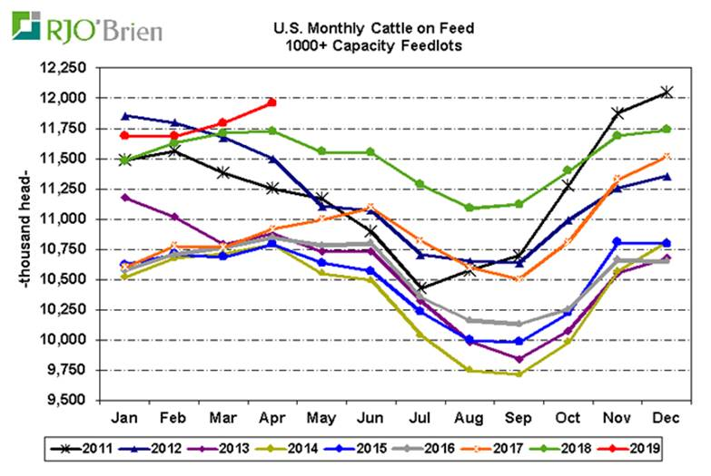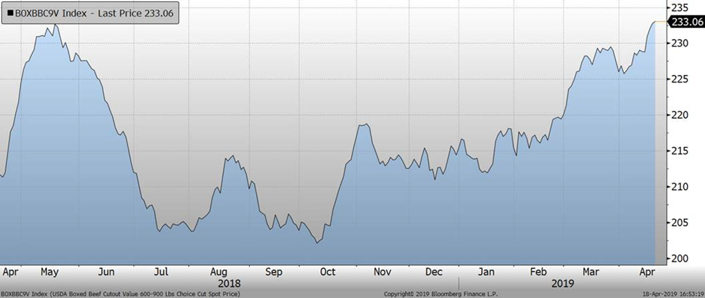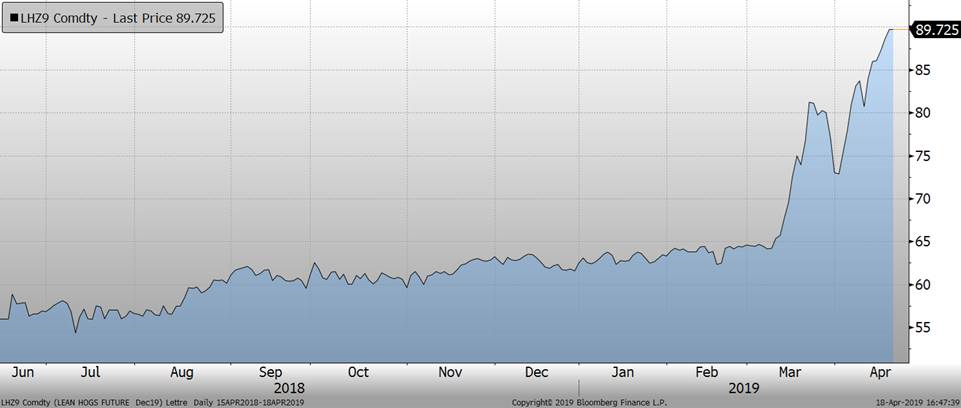 Le rapport de Cattle-on-Feed a démontré que les producteurs ont placé 4.8% plus d’animaux dans les parcs en mars 2019 par rapport à mars 2018, soit 1.4% de plus qu’anticipé. Les mises en marché se sont établis en baisse de 3.4%, en ligne avec les attentes. Ainsi, le nombre de bœuf en parc d’engraissement au 1er avril 2019 était de 11.96 M têtes, en hausse de 2.0% par rapport à 2018. Les rumeurs veut l’offre d’animaux deviendra plus grande dans les prochaines semaines, mais la demande continue à supporter les prix. Il faut retourner en décembre 2011 pour avoir un plus gros troupeau en parc.