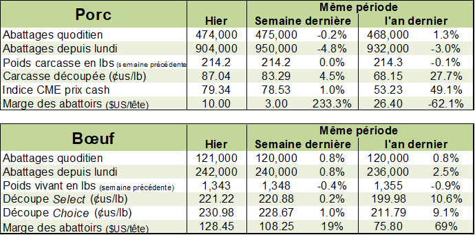 - Le poids moyen des porcs abattus est à la hausse de 1.3 livres par rapport à l’an dernier. Depuis une semaine, le gain de poids est de 0.8 livre. Cela peut sembler banal, mais normalement le poids devrait commencer à diminuer à cette période de l’année.