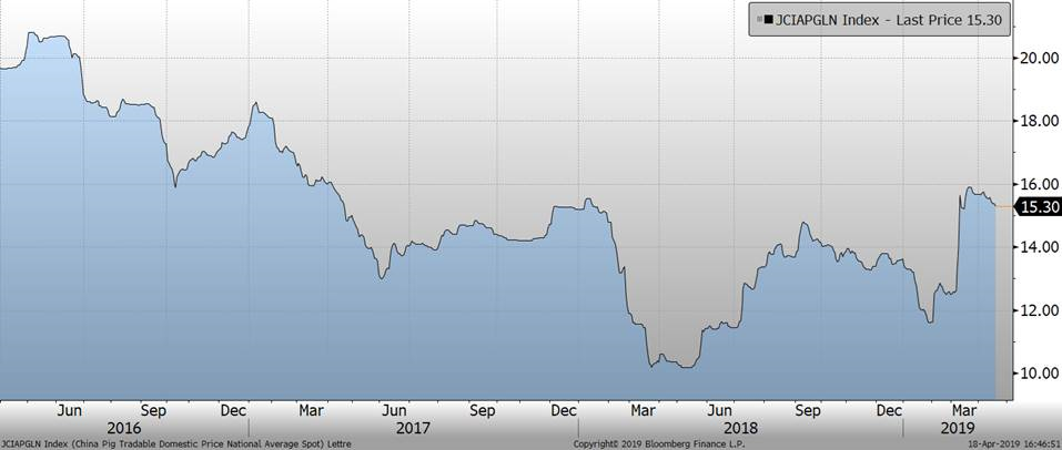 - Le directeur chinois de la recherche et des marchés dans le Ministère chinois d’agriculture a mentionné au cours de la nuit que la population porcine du pays avait diminué de 10.1% durant le premier trimestre de 2019. Las production de viandes avait baissé de 5.2% pendant la même période. Ces informations font suite aux données obtenues récemment qui montrait que depuis 1 an, le cheptel porcin avait diminué de 18.8% (mars 2018 / mars 2019) alors que la quantité de truies avait chuté de 21% durant les 12 derniers mois. Le fait que les éleveurs chinois liquident leur troupeau affecté par la PPA comble le manque de production pour l’instant.