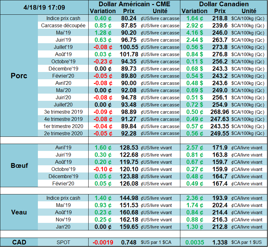 Le prix du bœuf continue de se faire tirer par le prix du porc. Le temps chaud et sec à venir semble inciter les détaillants à offrir des pièces de viande pour la saison de BBQ. De plus il semble que l’intérêt des consommateurs soit au rendez-vous d’après les indications des experts de l’industrie de détail. Le prix de la découpe terminait la journée à $233.06 ce qui demeure le plus haut niveau depuis juin 2018.