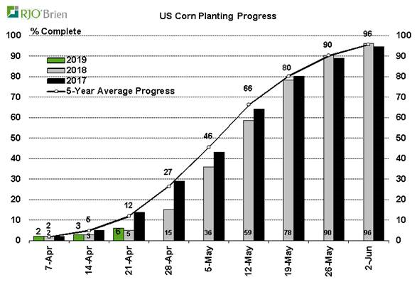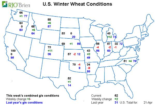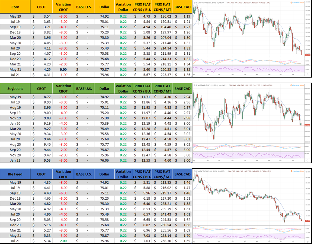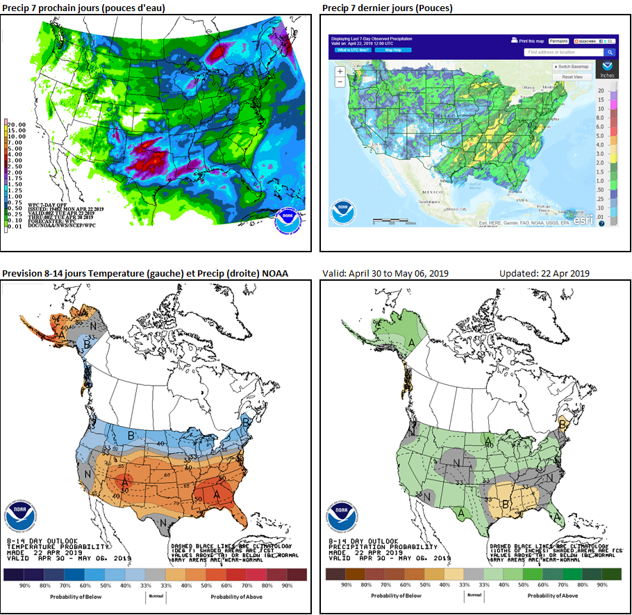 C’est un lent départ, le corn semé à 6% contrairement à 12% en moyenne pour ce temps-ci. Compte tenu qu’ils sont capable de semer grand et rapidement, le marché s’en inquiète pas trop pour le moment. Le soja n’est pas vraiment commencé encore, à peine 1%. Coté blé il va très bien, 62% de bonne ou excellente qualité c’est très solide et un des meilleur départ depuis un dizaine d’années. Ca l’explique le prix qui baisse…