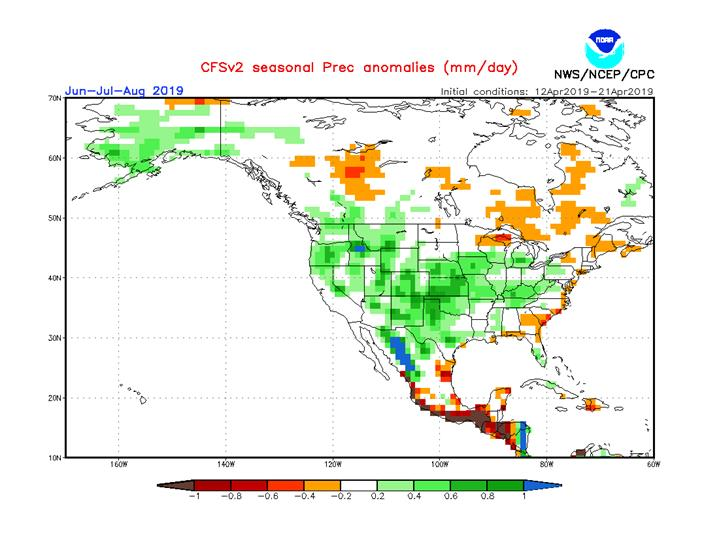 Météo : Peut-être pas parfait mais certains endroit ont pu sécher la semaine dernière en Iowa et devrait permettre de semer car cette semaine c’est faisable. Pas partout mais sur plusieurs endroits du Midwest devrait accélérer le pas. Le forecast saisonnier juin-juillet-aout n’est pas dangereux… Il devrait avoir suffisamment d’eau pour une belle récolte. Je le dit je le répète la météo peut changer, ça vaut ce que ça vaut mais les cartes sont là, je les partage.