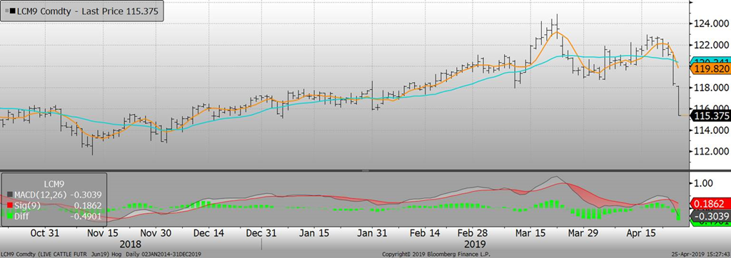 Malgré les agitations des contrats à terme en Bourse ces temps-ci, le prix au comptant demeure relativement stable ou même haussier. Le USDA rapporte des prix négociés à $127 USD. Ainsi l’écart entre le prix des contrats de juin et le prix au comptant demeure large ces jours-ci, à plus de 10 cents, ce qui incite peu à la vente du contrat de bœuf.