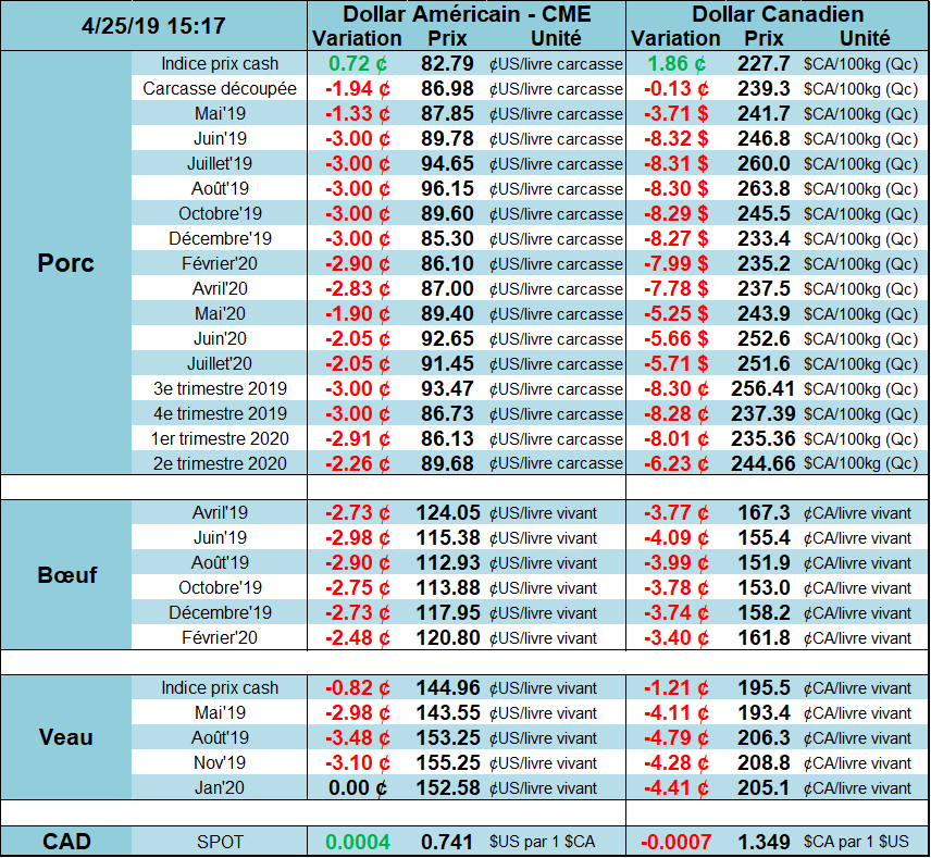 Contrairement aux exportations de viande de porc celles dans le bœuf étaient relativement satisfaisantes atteignant 23 100 tonnes métriques dans le rapport hebdomadaire. L’image est plus partagé quant aux achats des partenaires économiques américains dans leurs achats de viande de bœuf. Seuls le Japon et le Mexique ont réduit leurs achats depuis le début de l’année 2019 comparativement à l’année 2018. Il sera intéressant de suivre les négociations entre les États-Unis et le Japon ces temps-ci. Les deux pays ont débuté des discussions pour négocier une entente de commerce bilatérale. Le Japon aurait préféré voir les États-Unis dans le partenariat Transpacifique, mais Trump en a décidé autrement. Par contre, il est établi que le Japon veut un accès privilégié pour les fabricants automobile japonais en territoire américain. En contrepartie Trump veut probablement continué à mousser les commodités agricoles sur le marché japonais. Il est bien possible que tout le monde puisse s’entendre assez rapidement sur ce sujet.