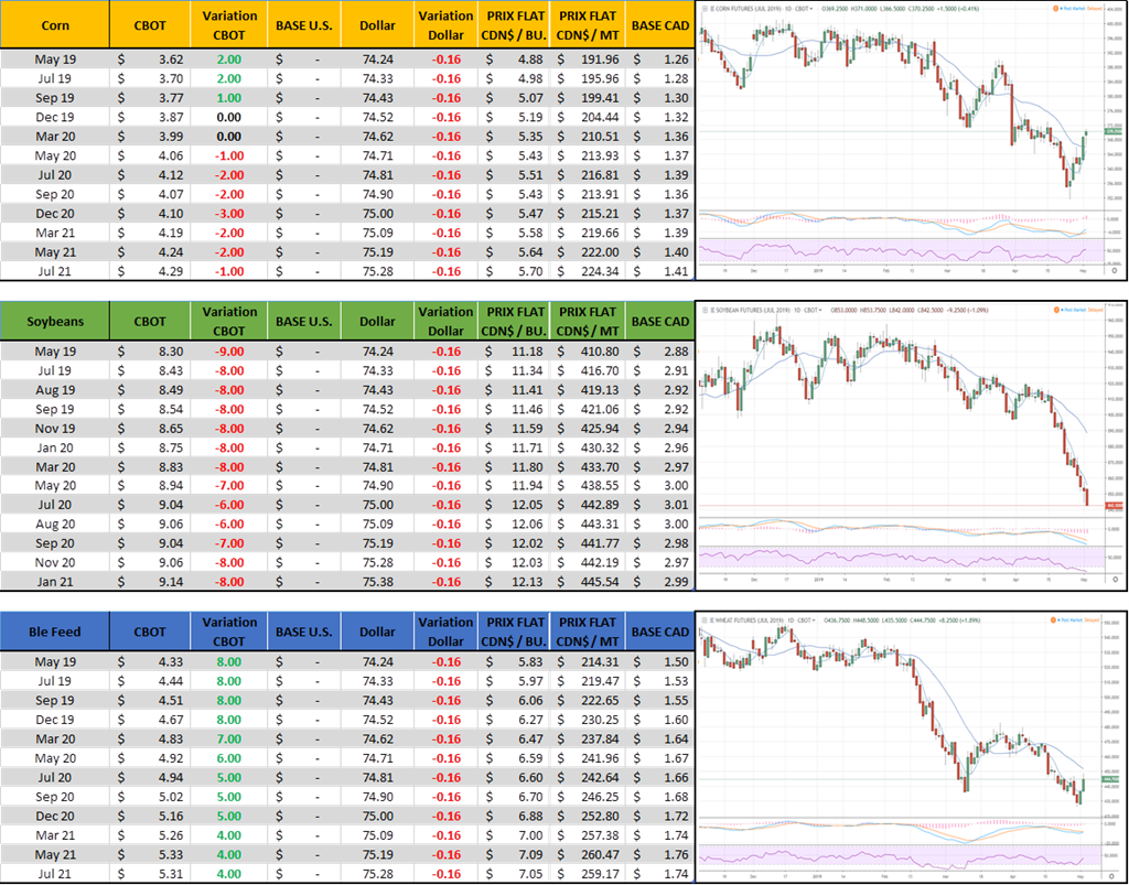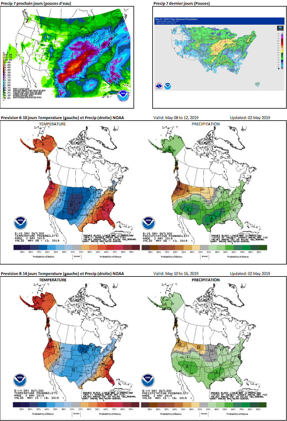 La météo n’est toujours pas idéale pour rattraper le retard dans les semis. Le forecast pour les deux prochaines semaines montre un temps frais et pluvieux et on risque donc d’arriver à la mi-mai avec une à deux semaine de retard. Plus on avance, et plus le retard s’accumule, plus il faudrait 1) peut-être commencer à réduire les superficies de maïs annoncées en mars et 2) réduire les probabilités d’un rendement record. Comprenez ici qu’on parle de probabilité, et non de garanti – c’est possible d’avoir un rendement correct à l’automne même si les semis ne sont pas idéal, simplement que c’est plus difficile et cela met plus de pression sur la météo cet été.