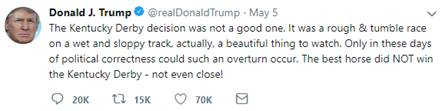 Ah, il a aussi donné son opinion sur les courses de chevaux dans le Kentucky, si ça t’intéresse. Il y voit une grande injustice. Peut-être qu’il a perdu son pari trifecta exacta et qu’il est frustré? Qui sait.