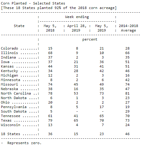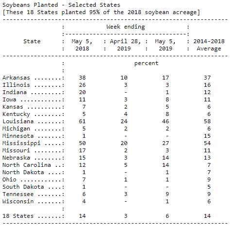 - Soja : semé à 6% vs 3% la semaine passée, en moyenne 14% (RETARD)