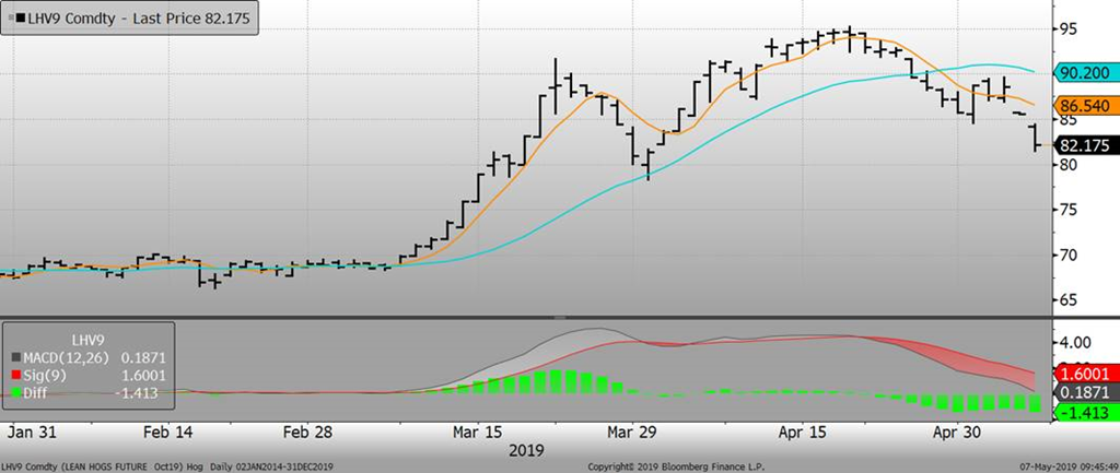 En raison de la baisse maximale de 3 cents hier, les limites seront de 4.5 cents/lb aujourd’hui à la Bourse de Chicago et le marché l’a déjà atteint après seulement 10 minutes de négociation. En deux jours, l’ensemble des échéances ont perdu 7 à 7.5 cents/lb, à l’exception du prix de mai. Techniquement, les prix ont cassé le support, établissant un nouveau beau depuis l’ascension de mars. Le prix de juin est à 85.5 cents/lb.