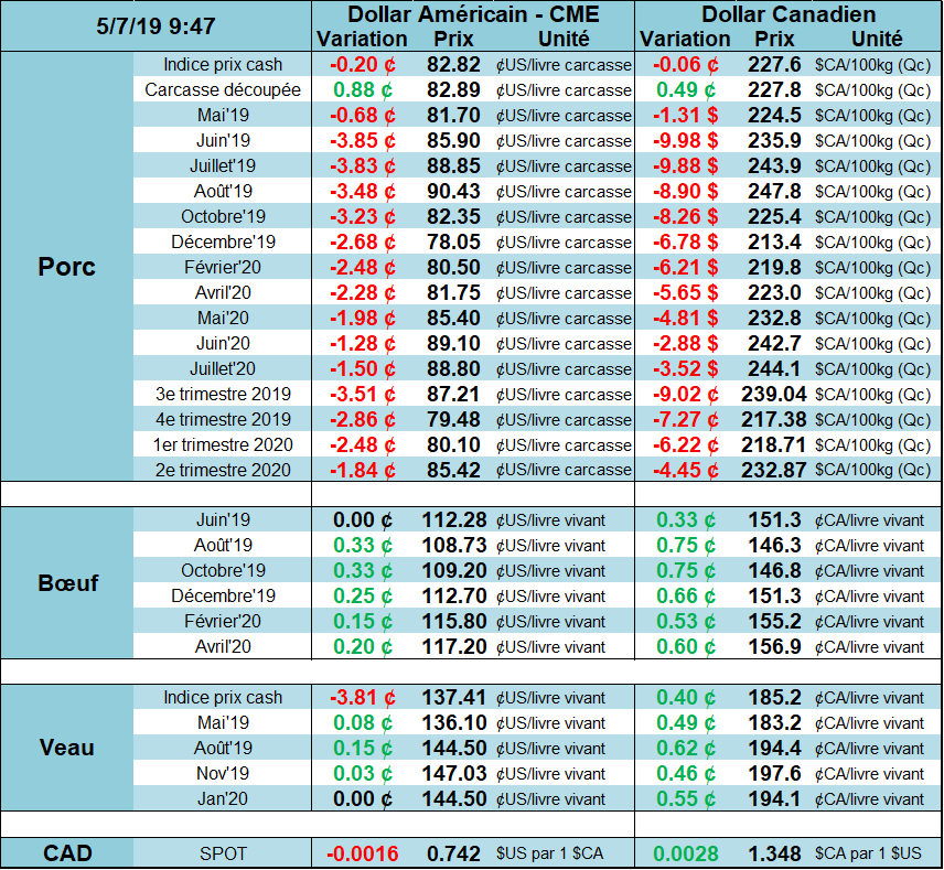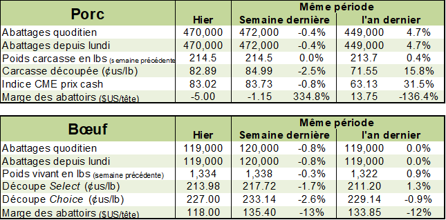 Le prix cash aux É.-U. stagne depuis déjà plus d’une semaine. Évidemment, c’est la baisse du prix des découpes, présentement à 83 cents/lb, qui pèse sur le marché comptant. Avec une marge négative pour les abattoirs, il faut s’attendre à voir le prix des découpes s’apprécier avant que le prix cash puisse
