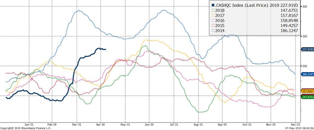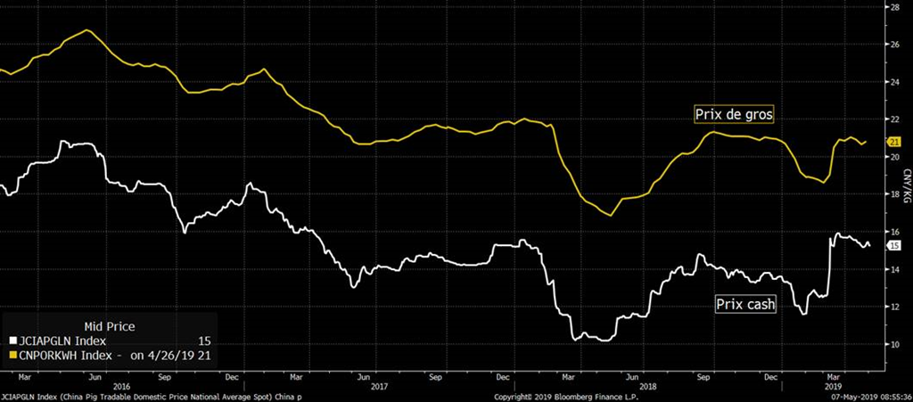 On note que sans les achats de la Chine, le marché américain est voué à un prix bien plus faible qu’anticipé par la bourse. Pendant ce temps, le prix en Chine n’augmente toujours pas, à 15.25 CNY/kg pour le prix cash et à 20.78 CNY/kg pour le prix de gros.