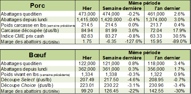 L’indice CME du prix au comptant se stabilise à $82.76 en hausse de $0.08 USD /100 livres, alors que la découpe a clôturé hier en baisse de $0.77 pour se situer à $84.94 USD / 100 livres.