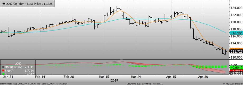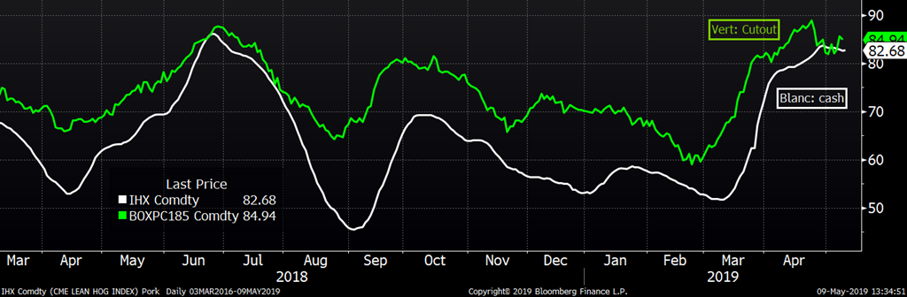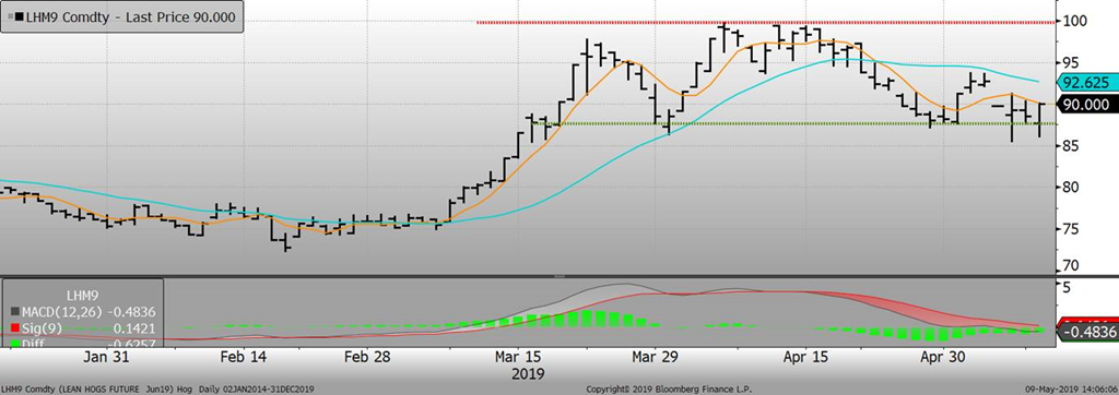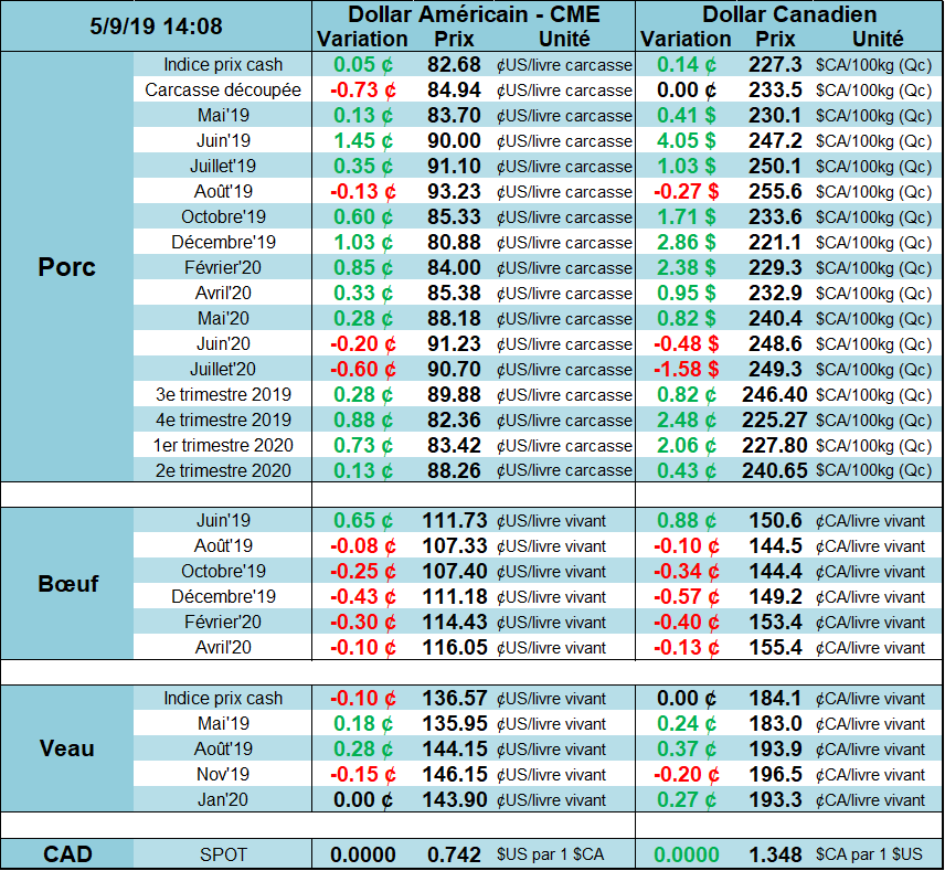 Le prix au comptant en Chine continue de vivoter depuis 1 mois maintenant, reculant par rapport aux gains de prix enregistrés en février et mars 2019. Le marché de Chicago pourra difficilement remonter si le prix en Chine ne remonte pas. La hausse enregistrée sur les contrats à terme était relié à la hausse prix au comptant en Chine. Il est certain que les autorités essaient de stimuler les investissements pour augmenter la production en 2020 et 2021 et qu’entre-temps, les acheteurs chinois essaient de proposer de nouvelles alternatives à la viande de porc. L’inflation en Chine a montré une progression la plus rapide en 6 mois et le prix du porc est grandement responsable de l’augmentation des prix alimentaires. Le prix de la viande de porc au détail a cru de 14.4% en avril, un rythme le plus élevé en 3 ans. Les rumeurs concernant la Chine sont à l’effet que certaines divergences d’opinions apparaissent dans la population quant aux politiques des dirigeants chinois. Il sera intéressant de voir comment les autorités réagiront face à ces critiques.