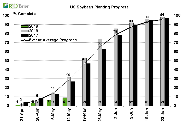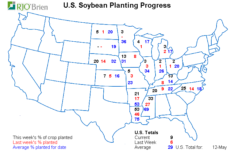- Soja : semé à 9% vs 6% semaine dernière ; moyenne 5 ans à 29%