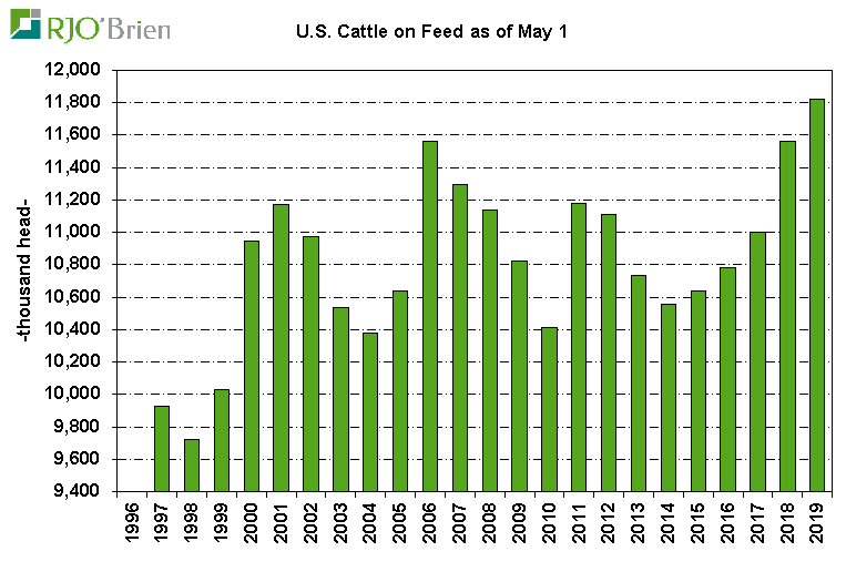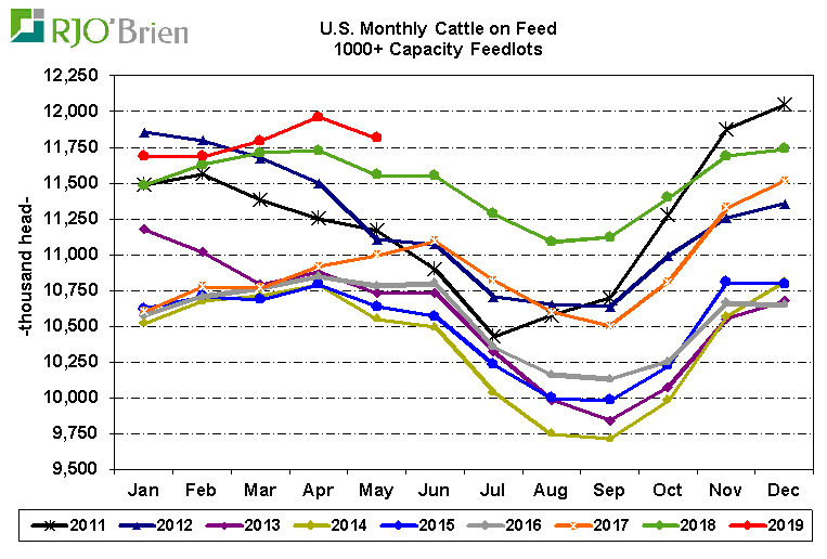 Les prix du bœuf demeurent sous pression et sont décevants en terme de performance malgré le rapport Cattle-on-Feed très positif publié vendredi dernier. Le USDA a rapporté que les placements de veaux dans les parcs se situaient à 108.7% par rapport à 2018. Les analystes prévoyaient plutôt une hausse de plus de 13.0%. Ceci signifie que le nombre d’animaux sera plus faible pour les abattages d’automne. Le nombre d’animaux au 1er mai était en hausse de 2.3% versus des attentes à 2.9%. Ce rapport marque peut-être la fin de la baisse saisonnière sur le prix et avec le retour en hausse du prix des coupes (Select & Choice), les contrats à terme devraient être favorisés à moyen terme.