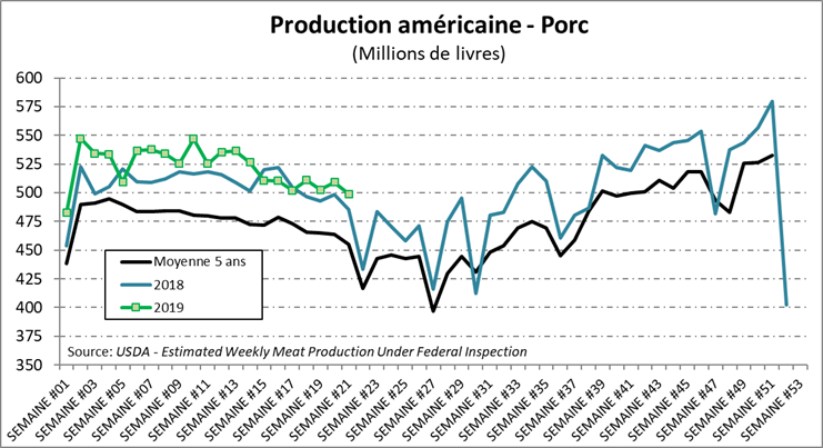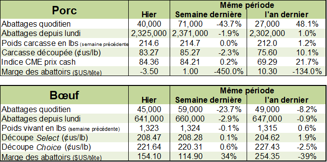Malgré le rapport positif des exportations jeudi dernier ainsi qu’un rapport de Cold Storage modérément positif (moins d’inventaires de viande), le marché ne voit pas de bonnes nouvelles à l’horizon. Pourtant, le Vietnam vient d’annoncer l’abattage de plus de 1.7 millions de têtes depuis l’éclosion de la fièvre porcine africaine dans ce pays. Ce chiffre représente près de 5% de la population porcine du pays. Les plus récents rapports provenant de la Chine suggéraient encore que la maladie est loin d’être sous contrôle et que les autorités auront fort à faire pour contrer la propagation de la maladie. La Chine demeure prudente dans ses importations en multipliant les sources d’approvisionnement. Les dirigeants chinois ne veulent absolument pas donner une grande partie des commandes aux américains ces temps-ci. Par contre, on apprenait que peu de pays ont l’infrastructure nécessaire (production et abattages) pour vendre efficacement à la Chine. Pour changer la direction des prix, le seul point majeur important à court terme serait le retrait des mesures tarifaires mexicaines sur le porc américain. Malgré l’entente entre les Etats-Unis, le Canada et le Mexique, ce pays n’a pas pris aucun engagement ferme d’enlever les différentes mesures votées l’an dernier.