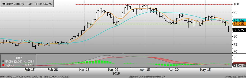 Les prix du porc continue de subir la sortie des fonds d’investissement de leurs contrats acheteurs et des producteurs voulant soudainement se protéger contre une baisse future des prix. Malgré tout, l’enthousiasme perdure sur les prix en 2020, mais cet enthousiasme semble se dissiper sur les échéances plus court terme (juin, juillet et août 2019). Les craintes relatives à la baisse du prix au comptant amorcée la semaine dernière ainsi que la baisse rapide du prix de la découpe sont les 2 raisons principales qui justifient le déclin des prix sur ces mois en particulier. Pour les ventes de vendredi, le prix cash reculait de -0.92 cent/lb à 82.85 ce qui donnera demain un indice CME de -0.71 à 83.31 cents. Après cette publication, les prix d’été étaient plus de -3.00 cents, sans oublier que les marchés ont terminé limit down vendredi. Au moins, le prix des découpes se redressent après une semaine difficile, en hausse de +2.69 cents/lb à 85.96 aujourd’hui.