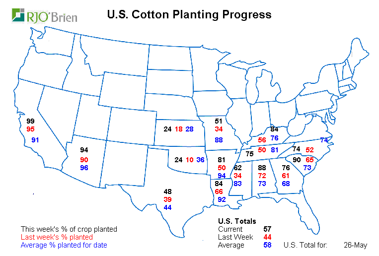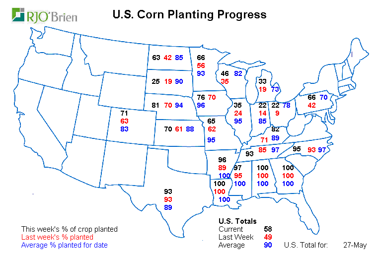 - Maïs semé à 58%, vs 49% la semaine dernière et 90% en moyenne.