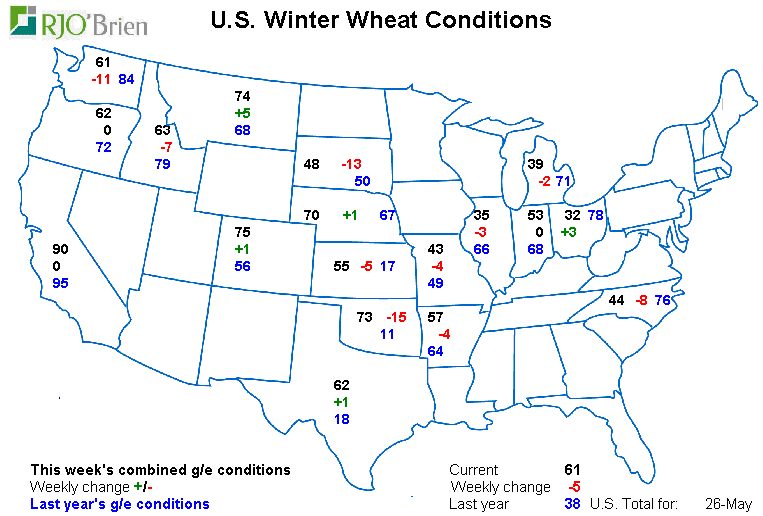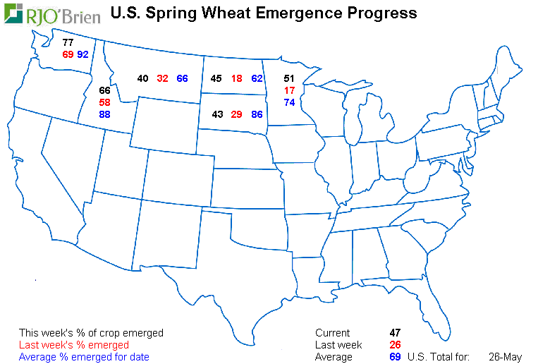 Mais aussi, tout ce qui est semé en ce moment ne doit pas être super beau non plus !! Je dis ça avec un pif de broker, et non d’agronome – je vous invite à me réécrire pour me donner du feedback! Tout ce qui est semé traine dans l’eau, dans la bouette, et n’arrive pas à bien décoller. Aussi, si le cultivateur n’est pas dans le champ à semer, je doute qu’il soit dans le champ à faire les arrosage. L’USDA n’a pas encore commencé à sortir les indice de qualité good/excellent pour le corn ni le soybeans mais je m’attend à ce que ce soit tout croche.