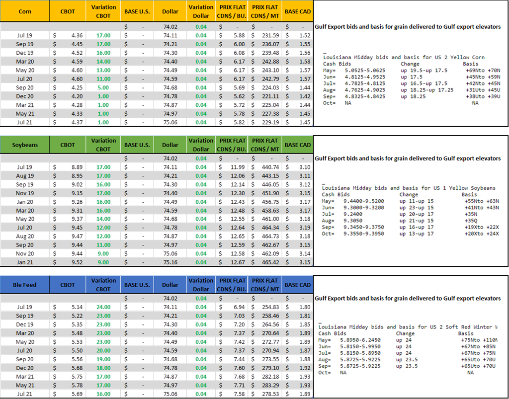 Avez-vous mal à la tête? Moi un peu, quand même. Hier a été spécial comme journée; forte hausse dès l’ouverture suite à la progression des semis (58% corn et 29% soybeans). Ensuite le lendemain – sans trop de raison – le marché perd tous les gains ; le maïs qui était +15 cents devient à la baisse de 8 cents. De même. Les cartes météos peut-être un peu mieux, mais très loin d’être idéale pour même penser rattraper le retard.