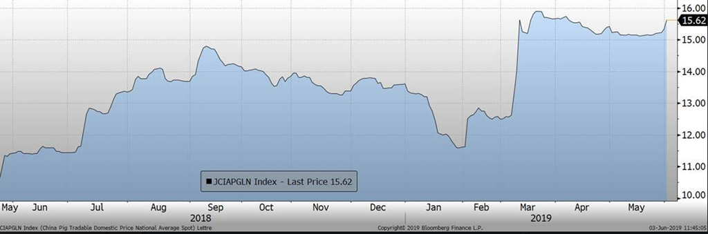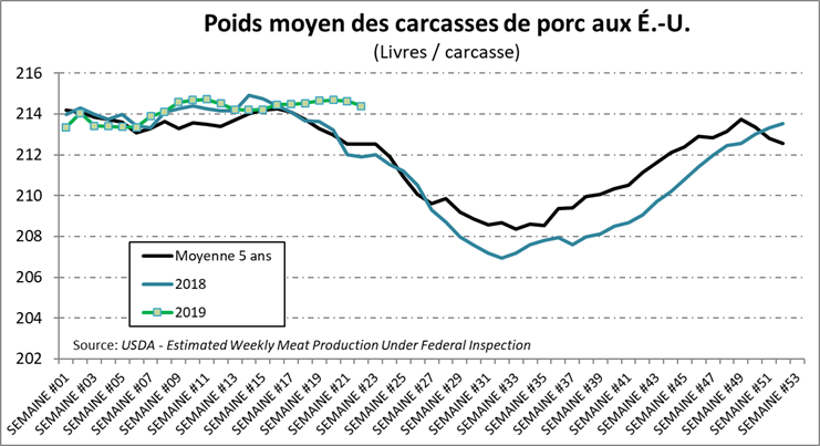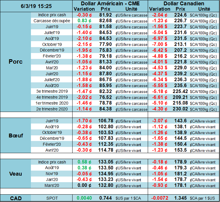 En parlant des exportations, la Chine a encore commandé 39 100 tonnes métriques de viande de porc américain la semaine dernière. Par contre, ce sont des commandes et non pas des exportations. Il est toujours possible que ces commandes soient éventuellement annulées. Le marché affiche un scepticisme face à ces données. De plus, les relations entre le Mexique et les Etats-Unis demeurent tendues alors que Trump a décidé de mettre en place des tarifs sur les importations de biens mexicains. Encore une fois, ce sont les consommateurs américains qui font les frais des tarifs puisque les prix sont majorés en sol américain. Le Mexique demeure étonnamment calme face à ce bras d’honneur de la part de leur partenaire surtout lorsque que celui-ci veut faire entériner le document d’entente tripartite que représente l’ALENA 2.0!