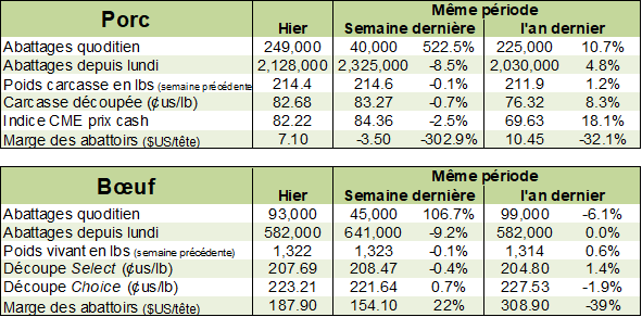 Le seul point intéressant à noter en ce début de semaine demeure la hausse du prix au comptant en Chine ce weekend. En effet, le prix s’est apprécié de 1.89% en 1 journée et se situe à son plus haut niveau depuis le début du mois d’avril. On s’approche des sommets de 2019 atteints en mars. L’attention se tourne maintenant afin de voir si cette hausse se poursuivra dans les prochains jours. Plusieurs acheteurs continuent d’acheter timidement des quantités appréciables de viande de porcs en sol américain. Mais tout ce travail se fait très très discrètement.